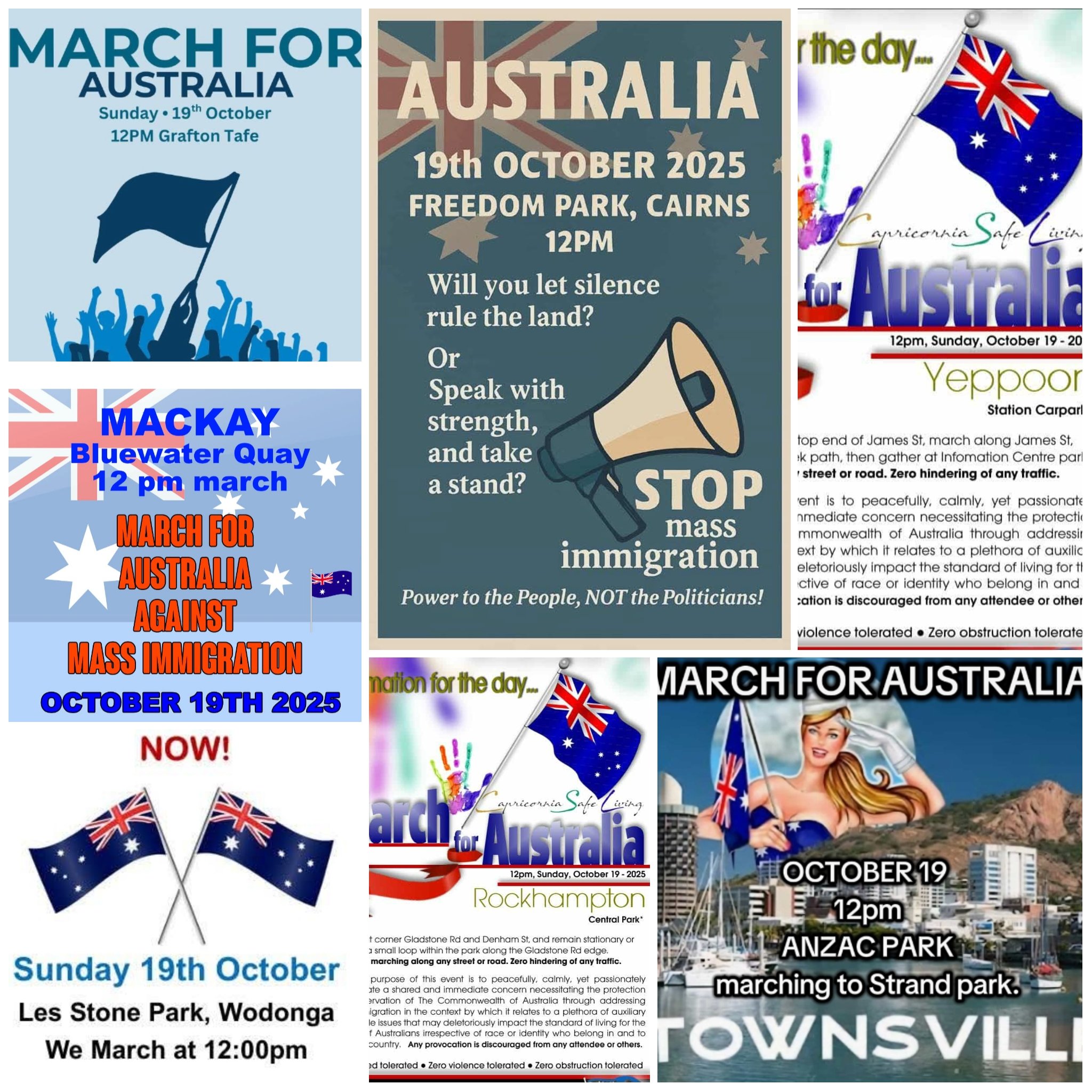 So far, no flyers seem to have been put up for Adelaide, Hobart, Canberra or Darwin, but information about all the protests there and elsewhere can be found here and here and in the image below. Details of planned protests, for Cairns, Grafton, Mackay, Rockhampton, Townsville, Wodonga and Yeppoon, can be found in the image below: